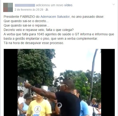 Existe um vídeo circulando na rede social Facebook, de um discurso feito em junho do ano passado por Fabrizio Oliveira, presidente da Ademacen, onde o mesmo salientava que para cumprimento do piso seria necessário o repasse, como preconiza o artigo 9G da Lei 12.994 (Lei do Piso). Nesse mesmo vídeo, a pessoa responsável pela publicação na rede faz alguns questionamentos, como: Já saiu o decreto e o repasse, o que falta agora? Só basta a prefeitura pagar o Piso que o Governo Federal complementa o valor referente aos 1.045 agentes restantes, segundo o GT (essa parte já é uma afirmação).
