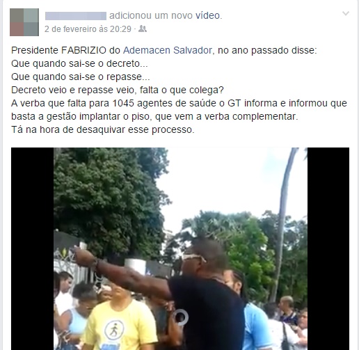 Existe um vídeo circulando na rede social Facebook, de um discurso feito em junho do ano passado por Fabrizio Oliveira, presidente da Ademacen, onde o mesmo salientava que para cumprimento do piso seria necessário o repasse, como preconiza o artigo 9G da Lei 12.994 (Lei do Piso). Nesse mesmo vídeo, a pessoa responsável pela publicação na rede faz alguns questionamentos, como: Já saiu o decreto e o repasse, o que falta agora? Só basta a prefeitura pagar o Piso que o Governo Federal complementa o valor referente aos 1.045 agentes restantes, segundo o GT (essa parte já é uma afirmação).