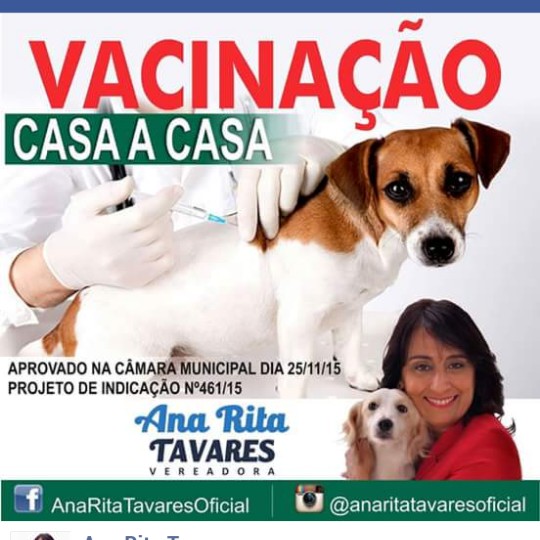 Foi aprovado na Sessão do dia 25/11/15, o Projeto de Indicação 461/15, de autoria da vereadora Ana Rita Tavares (PMB), sugerindo que a vacinação antirrábica, destinada a cães e gatos, seja realizada nos domicílios dos guardiões, e não apenas em postos de saúde e espaço públicos, como é feito atualmente na cidade.